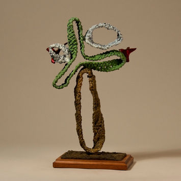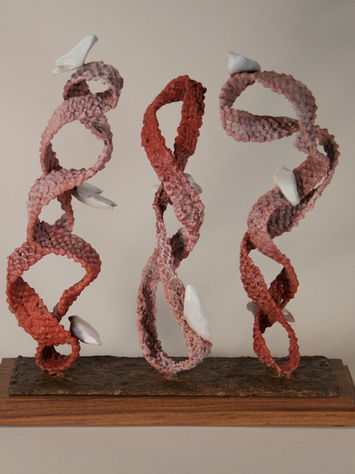 I have experimented with the wide range of textures obtainable with contemporary yarns.I have been knitting strips of varying sizes, widths, proportions, shapes and textures--and, when it comes to patina, colors. Some compositions utilize only one or two Moebius strips, others quite a few. Birds continue to be an indispensable element of my pieces; they are more abstract than my previous birds.